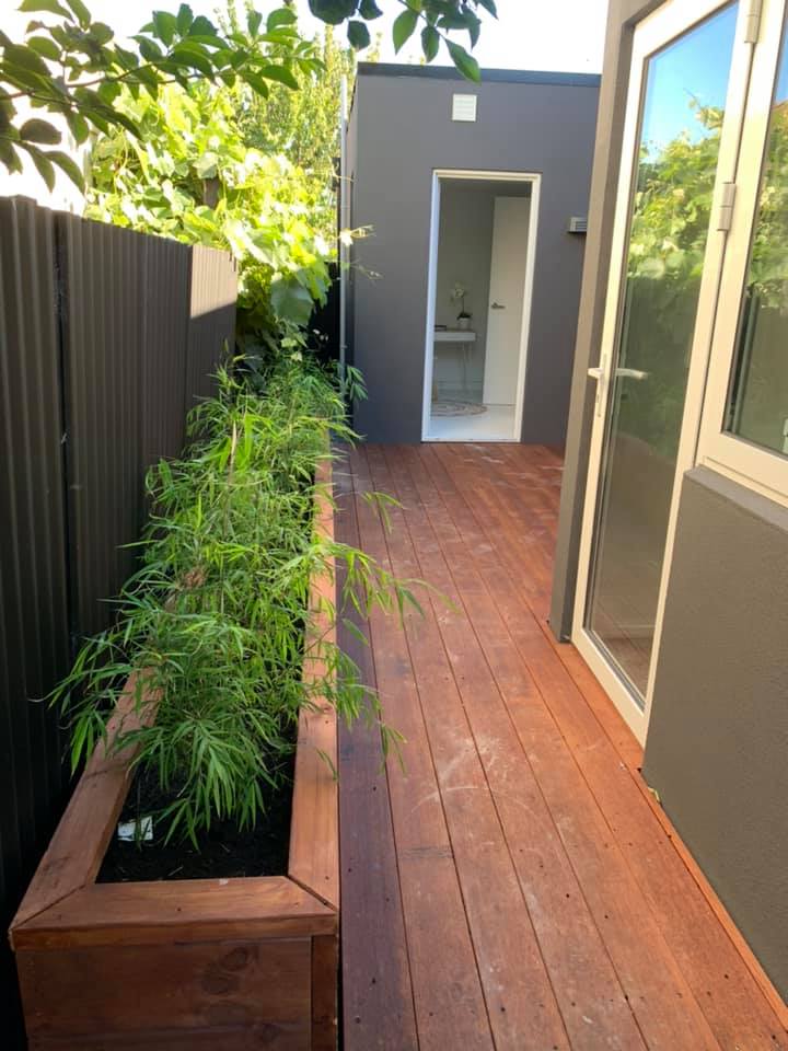 A nice quite and peaceful kwila deck for the owners to retreat to after a hard day of work. The incorperation of the planter box add an added element, that can be used to grow your own vegetables or herbs.