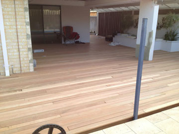 A massive batu timber deck wrapping around the back and side of the house, including around a fish pond. This yellow/brown timber will darken with age and look good for years to come