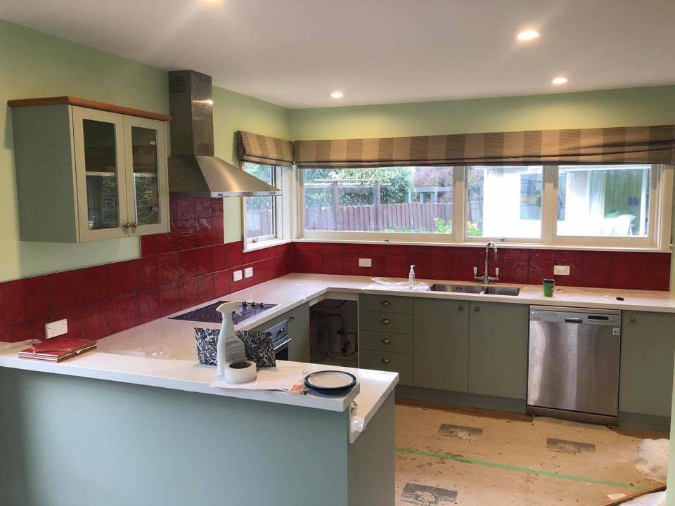 We were tasked with doing some EQC repairs to this house, and with an outdated kitchen it was time for an upgrade. With a nice new timber foor (underneath the floor protection) and a crisp red tile splash back this kitchen has a much more vibrant feel than the old one.